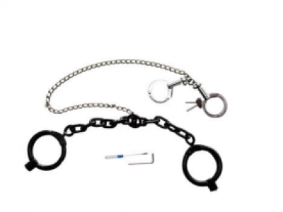 尺寸:手铐:最小开放尺寸:54mm;环直径尺寸:47mm-80mm;全长:297mm;铐点;19 脚镣:中心距:600mm; 环直径尺寸:90mm; 全长:750mm;中间连接链长:700±10mm